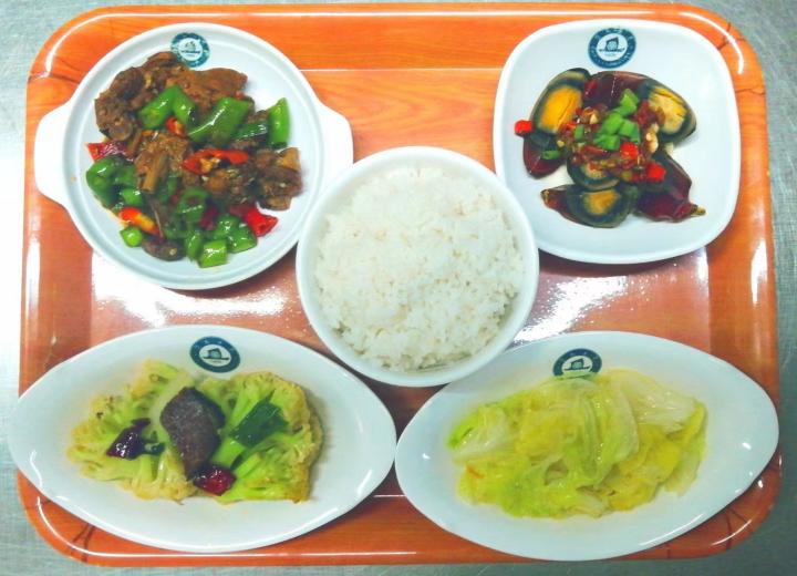E套餐(辣):血酱鸭+麻辣皮蛋+干锅菜花+青菜+米饭 单价:20元